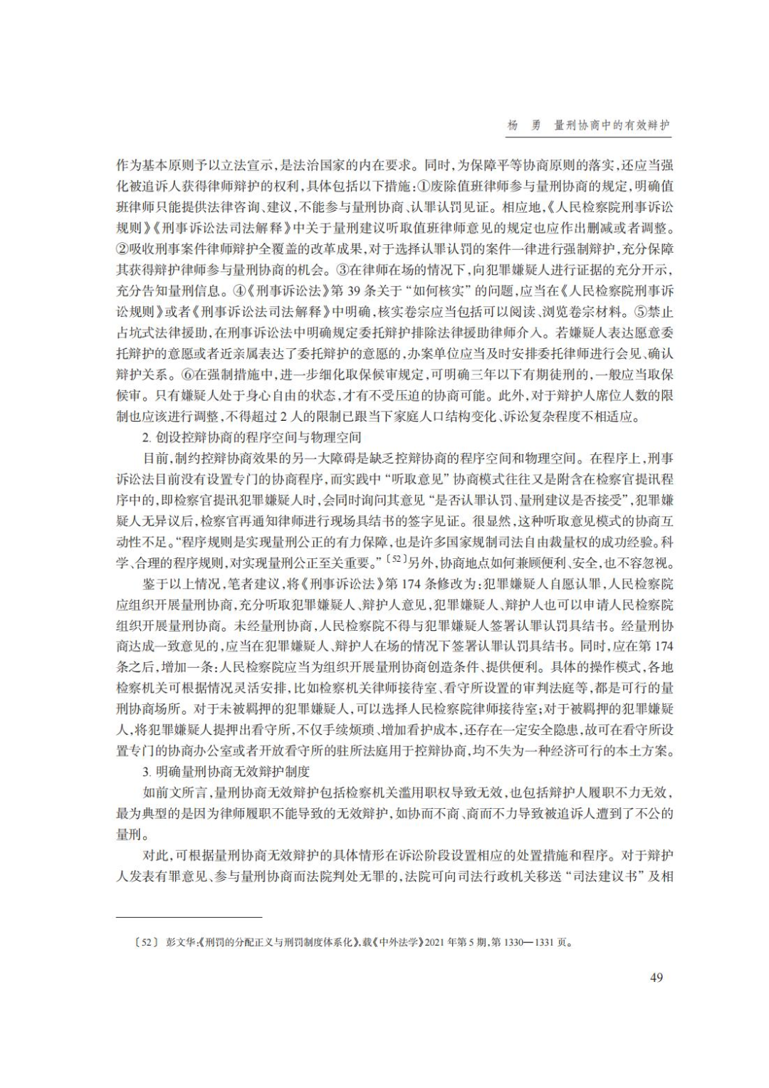 摘要:在我国刑事司法实践中,长期存在“三重三轻”现象:“重定罪、轻量刑”,“重无罪辩护、轻量刑辩护”,“重自由刑辩护、轻财产刑辩护”,量刑裁量与量刑辩护未引起应有的重视,量刑不公成为普遍性问题。在协商性司法的潮流下,量刑协商走过了一条从禁忌到‘星星之火’的演进之路,以量刑协商为中心的量刑辩护的重要性日益凸显。然而,量刑协商程序中常存在无效辩护情况,表现为“不听不取”“听而不取”“协而不商”“商而不力”等四种形态。量刑协商有效辩护的本质内涵是通过实质化的量刑协商实现有利于被追诉人的量刑结果,其判断标准应从‘尽责辩护’与‘有效果辩护’双重角度进行考察,具体可从协商主体、协商筹码、协商方式、协商效果等四个方面予以厘定。在我国即将迎来刑事诉讼法第四次修改之际,为保障量刑协商中有效辩护的实现,应当秉持有效辩护理念,在吸收司法改革成果和实践经验的基础上,从立法设计、配套规范、实操方案等路径进行完善。