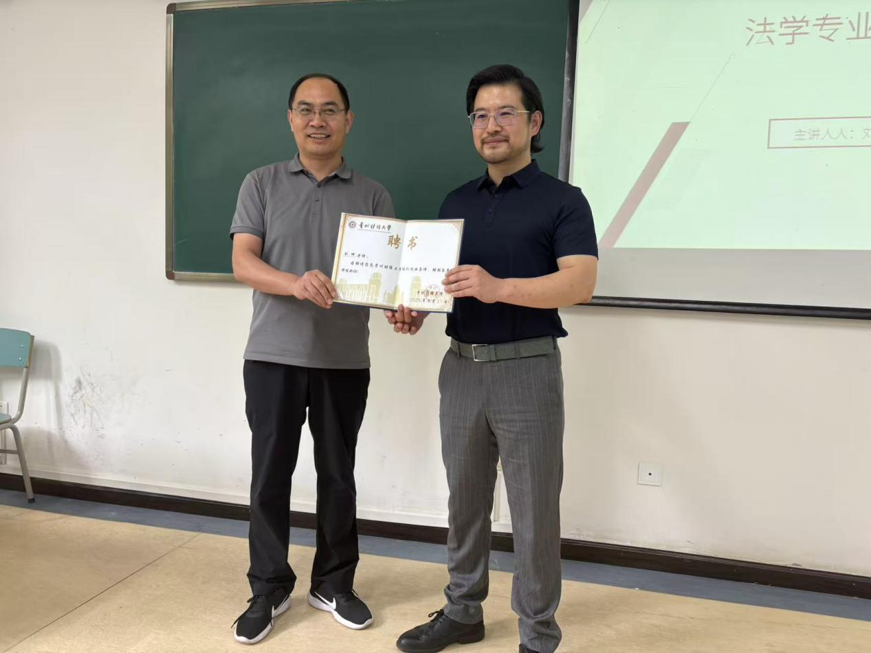 (乐动官方注册 胡小玲 张云舒 报道|摄影 )为助力学生明晰职业方向,增强职业规划能力,乐动官方注册于6月3日在文德楼103教室举办《法学专业就业和职业选择》专题讲座。本次讲座特邀贵州公成律师事务所主任刘坤授课,乐动官方注册党委书记邵新顺出席并为刘坤颁发贵州财经大学校外就业导师聘书,120余名师生参加本次讲座。
